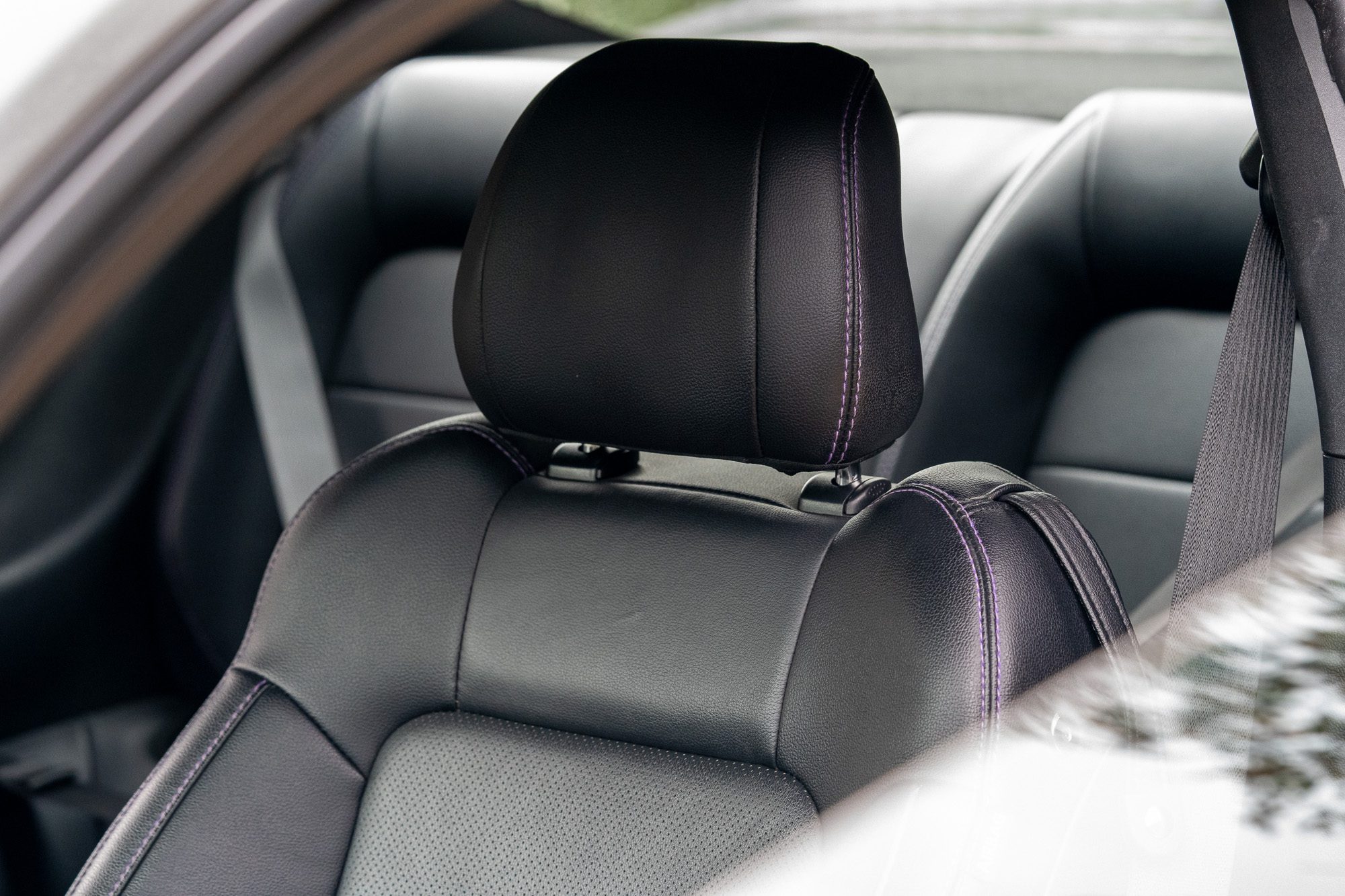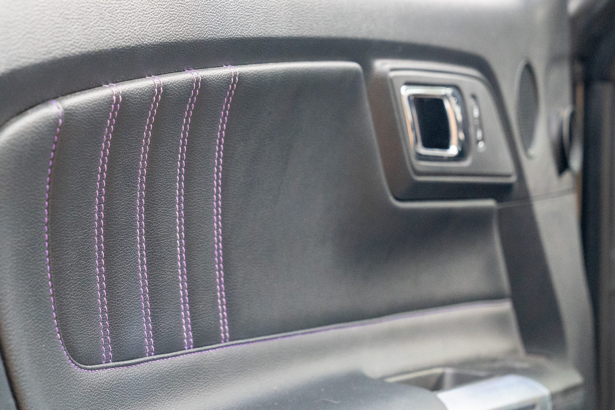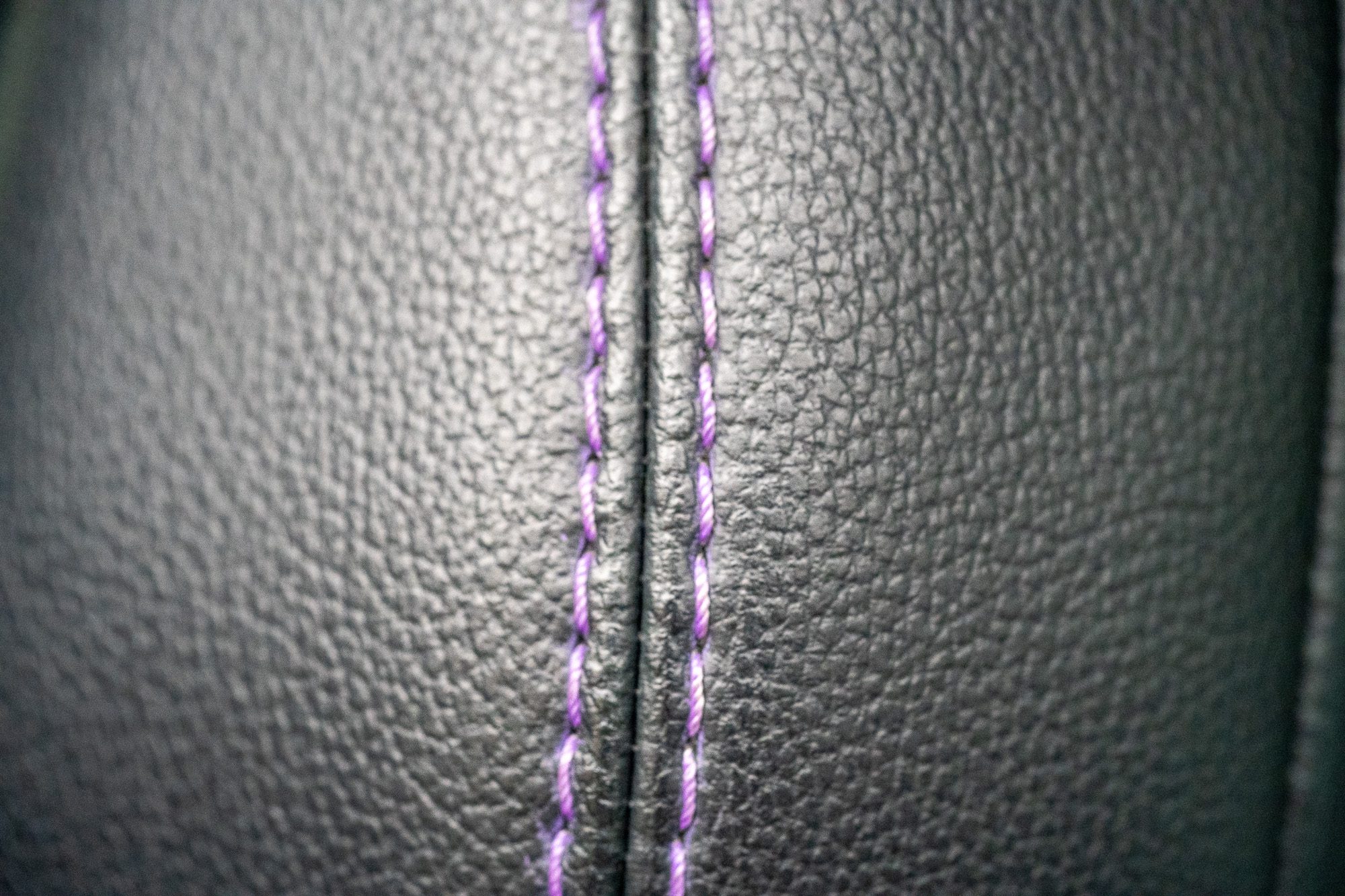 - Black leather with purple colour-coded stitching