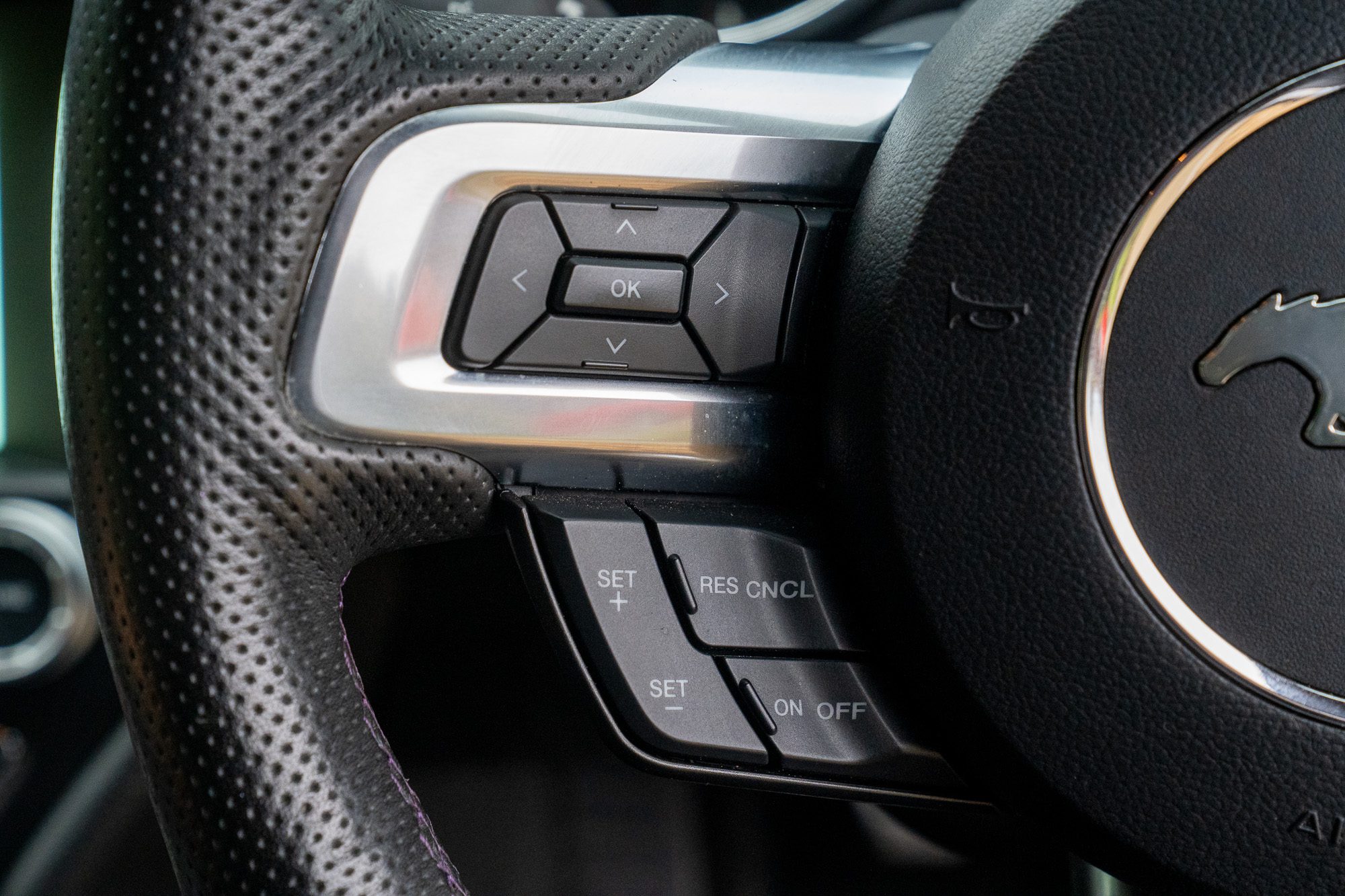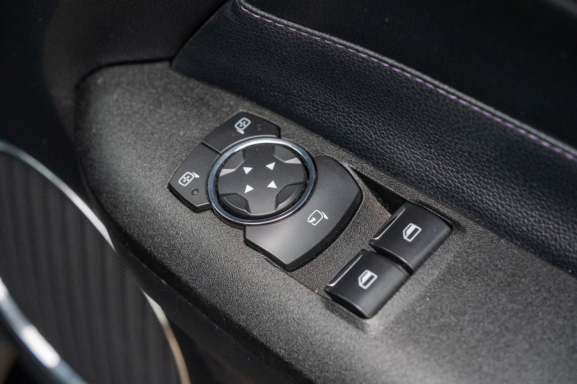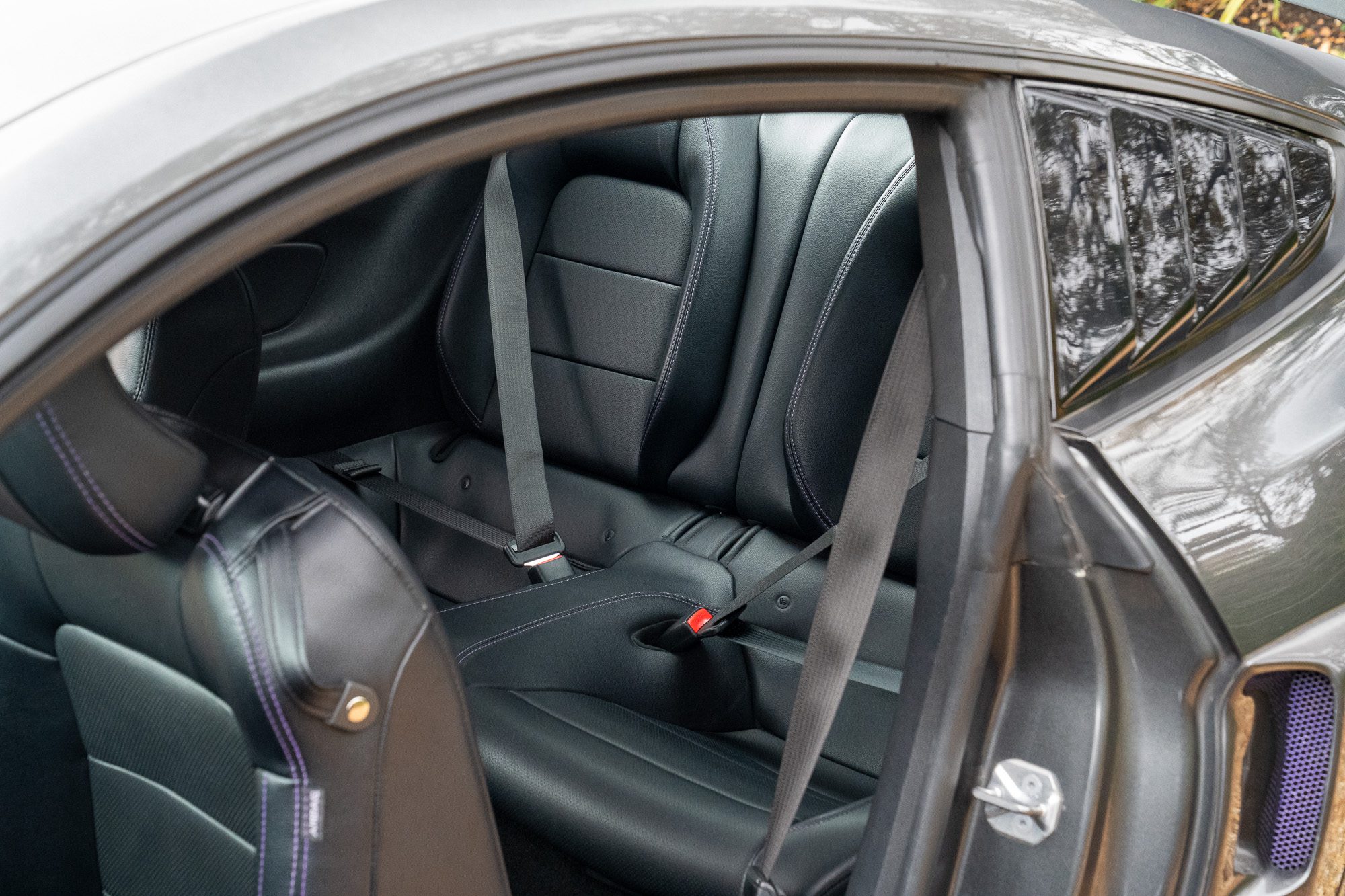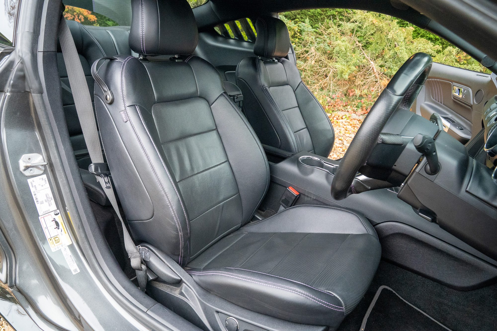 - Black leather with purple colour-coded stitching